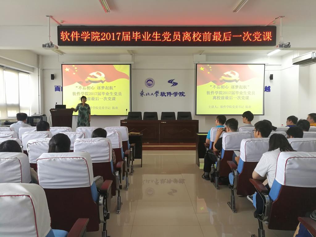 6月16日,欧亿体育学生党总支在浑南校区信息学馆B520室举行了2017届毕业生党员离校前最后一次党课。欧亿体育党委书记陈欢为毕业生党员做了“不忘初心 逐梦起航”专题党课。全体2017届毕业生党员出席活动,活动由党委组织员王海霞主持。