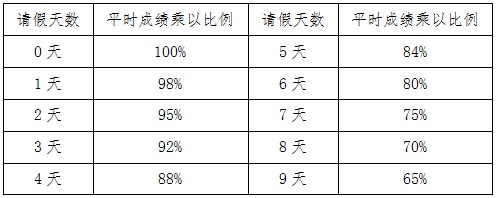(1)平时成绩占总成绩的50%,其中《东北大学欧亿体育实训阶段总结报告》成绩占10%、《东北大学欧亿体育学生实训验收成绩评定表》成绩占40%。另外,根据出勤请假情况对平时成绩进行调整,平时成绩乘以比例与请假天数关系如下: