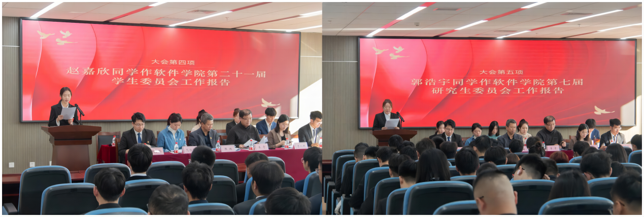 赵嘉欣同学代表第二十一届学生委员会作了题为“传承爱国基因,勇担历史使命,站在新百年起点上,为特色化欧亿体育建设贡献青春力量”的工作报告。郭浩宇同学代表第七届研究生委员会作了题为“怀抱梦想脚踏实地,敢想敢为善作善成,团结带领广大研究生在全面建设社会主义现代化国家的新征程中砥砺前行”工作报告。