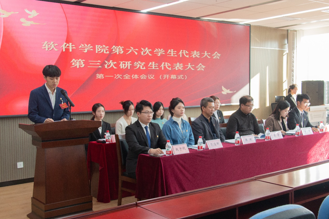 大会在雄壮的国歌声中拉开帷幕。校学生会主席团成员赵宇航代表校学生会致贺词,机器人科学与工程学院学生会执行主席翟航齐代表兄弟学院学生会致贺词。