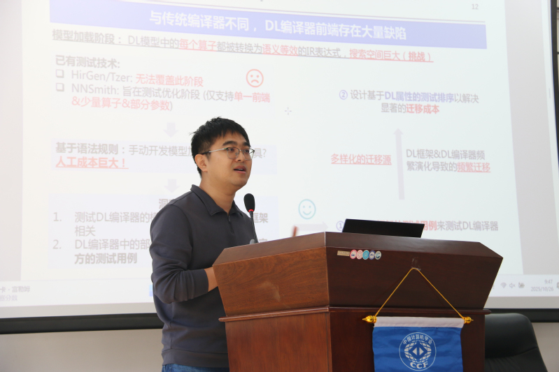 天津大学欧亿体育教授、副院长陈俊洁做《面向AI 编译器的测试技术研究》报告分享。他讲解AI编译器是连接AI模型与底层硬件的关键枢纽,其正确性直接关系到AI系统的安全。然而,AI编译器结构复杂、优化策略多样,传统测试方法难以有效揭示潜在缺陷。研究系统开展了面向AI编译器的测试技术研究,提出融合数据驱动与语义分析的测试用例生成方法,显著提升了测试的合法性与揭错能力。研究聚焦于TVM、MLIR等主流AI编译基础设施,构建了自动化测试框架,对算子转换、编译优化等关键环节实现了系统化验证。实践结果表明,该技术已成功发现并确认上百个真实缺陷,其中多数已被官方社区确认并修复,有效提升了AI编译基础软件的可靠性与安全性,为智能软件质量保障提供了创新性技术路径与方法支撑。
